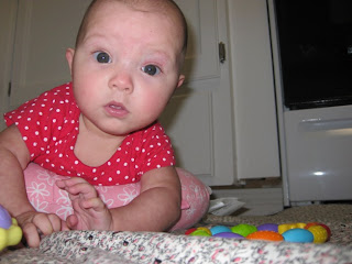 Overall though she tested in at four months and ten days. They were counting her as being four months and one day so that was definitely a good assessment. The only area where she came in low was language. But the PT said before the assessment that she doesn't like the language part because it's not very accurate at this age. She also said as she was giving the results (and Ellie was yammering) that Ellie would have scored higher if she had been talking like she was then during the assessment. In other words, Ellie's doing great!!